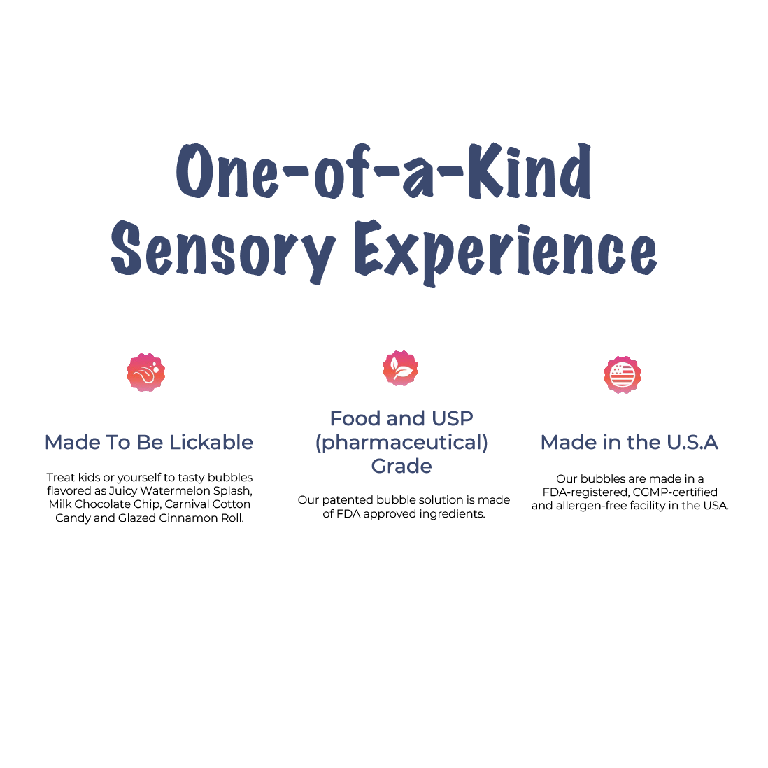 Fun and tasty bubble treats for kids and adults! Safe & tasty bubbles created by pediatricians: BubbleLick are lickable, edible flavored bubbles that taste just like cotton candy. These bubbles are safe and comprised of only Food-Grade and USP (Pharmaceutical) grade ingredients. Works in bubble machines & other bubble toys Perfect for indoor and outdoor use Special formula does not leave residues on floors High quality, allergen-friendly Made in the USA only Produced and packaged in an FDA-registered, CGMP certified & allergen-free facility *Bubbles are temperature sensitive and may separate in cold temperatures. Shake well before use.