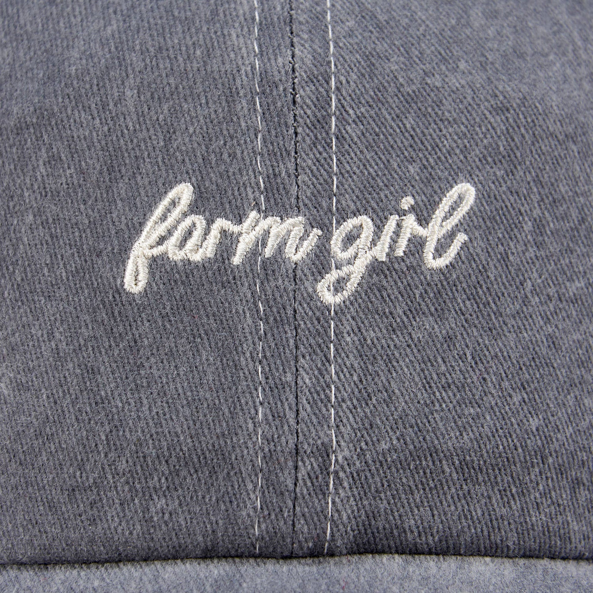 A stonewashed black baseball cap from our Farmhouse Collection displaying a fun farm inspired sentiment that reads "Farm Girl" with cream thread accents. Farm hat features fully embroidered sentiment for added detail. Our Farm Girl baseball cap is one size fits most with an adjustable metal buckle to create the perfect fit. Hand wash only. A fun farm-themed gift perfect for an everyday accessory.