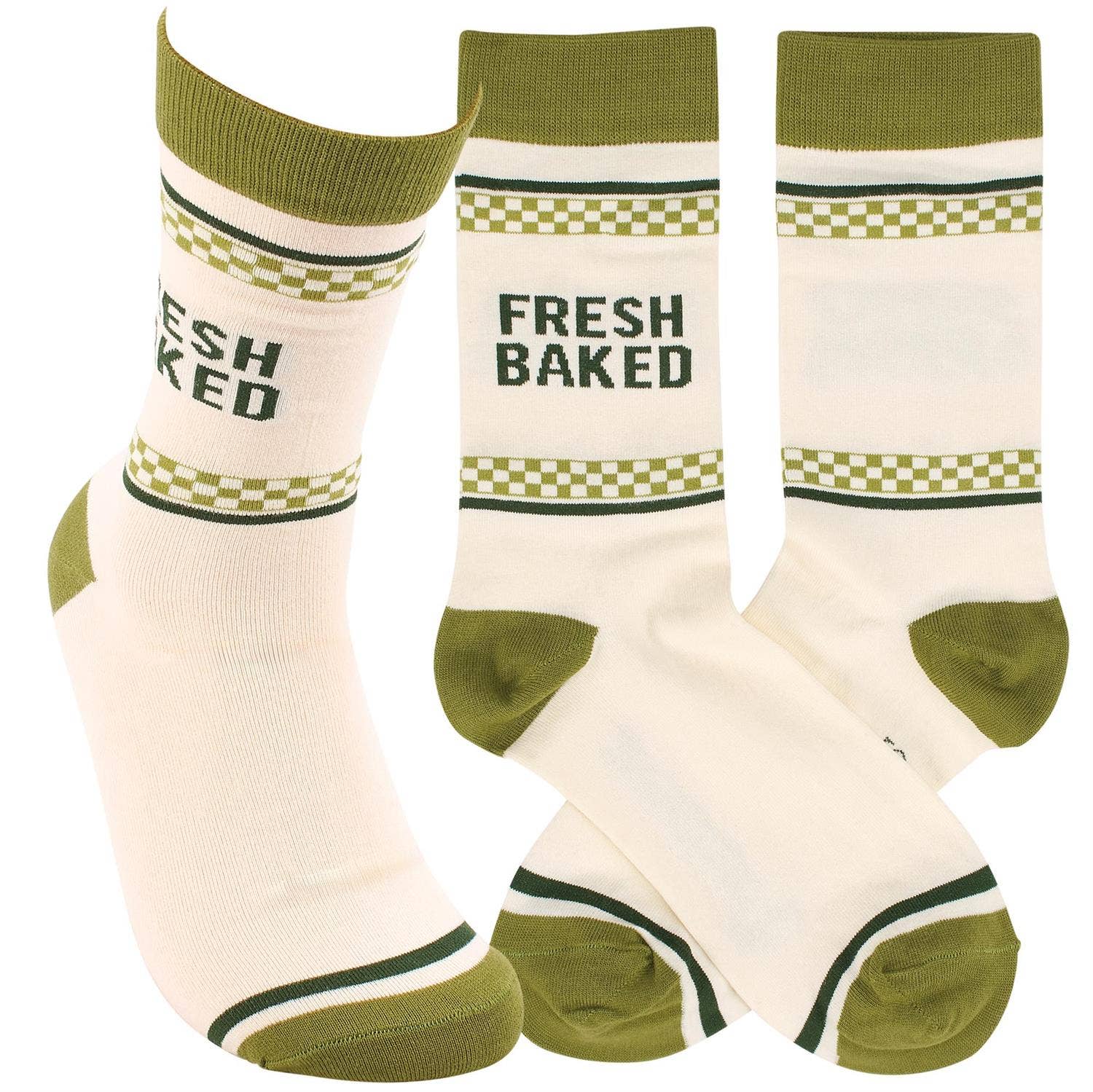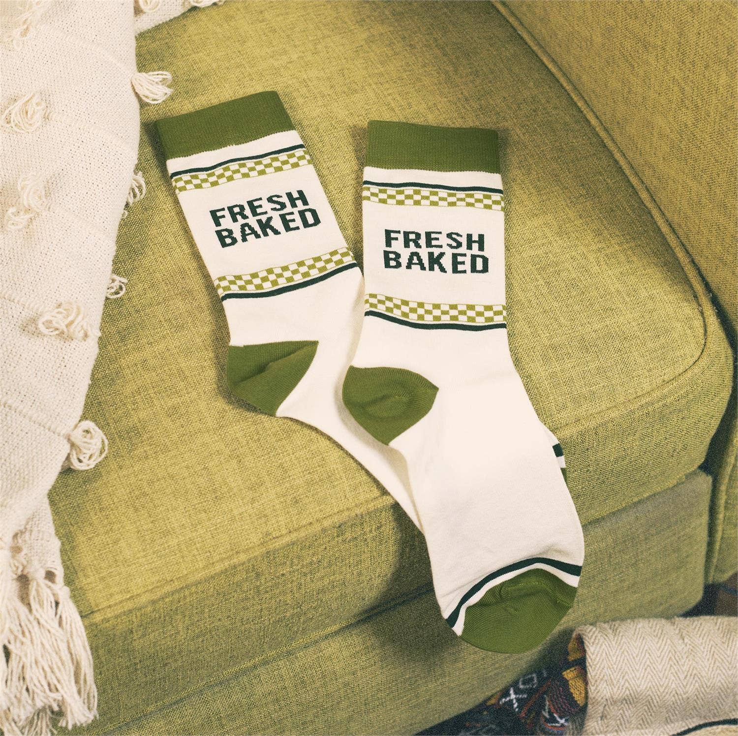Smell that? I'm done. This pair of colorful socks flaunts an earthy inspired pattern with a chill sentiment that reads "Fresh Baked." Questionables socks are made with a cotton, nylon, and spandex blend for a one size fits most design and packaged on a clear plastic hanger with header card for graceful display in store. Our Fresh Baked socks perfect for maximizing chill at home or gifting to pass that feeling to someone who needs it. Colorful and cozy socks always make a great gift that offer new ways to express themselves every day.