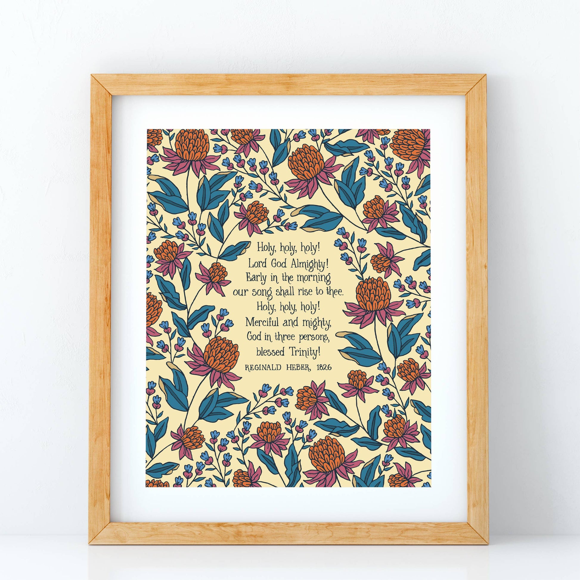 Welcome loved ones into your home with this Holy, Holy, Holy! art print. The much loved hymn, surrounded by vibrant gemstone toned florals, will freshen up any room. Quality printing and superb design make this print stand out. Illustrated by Kate Whitley.
